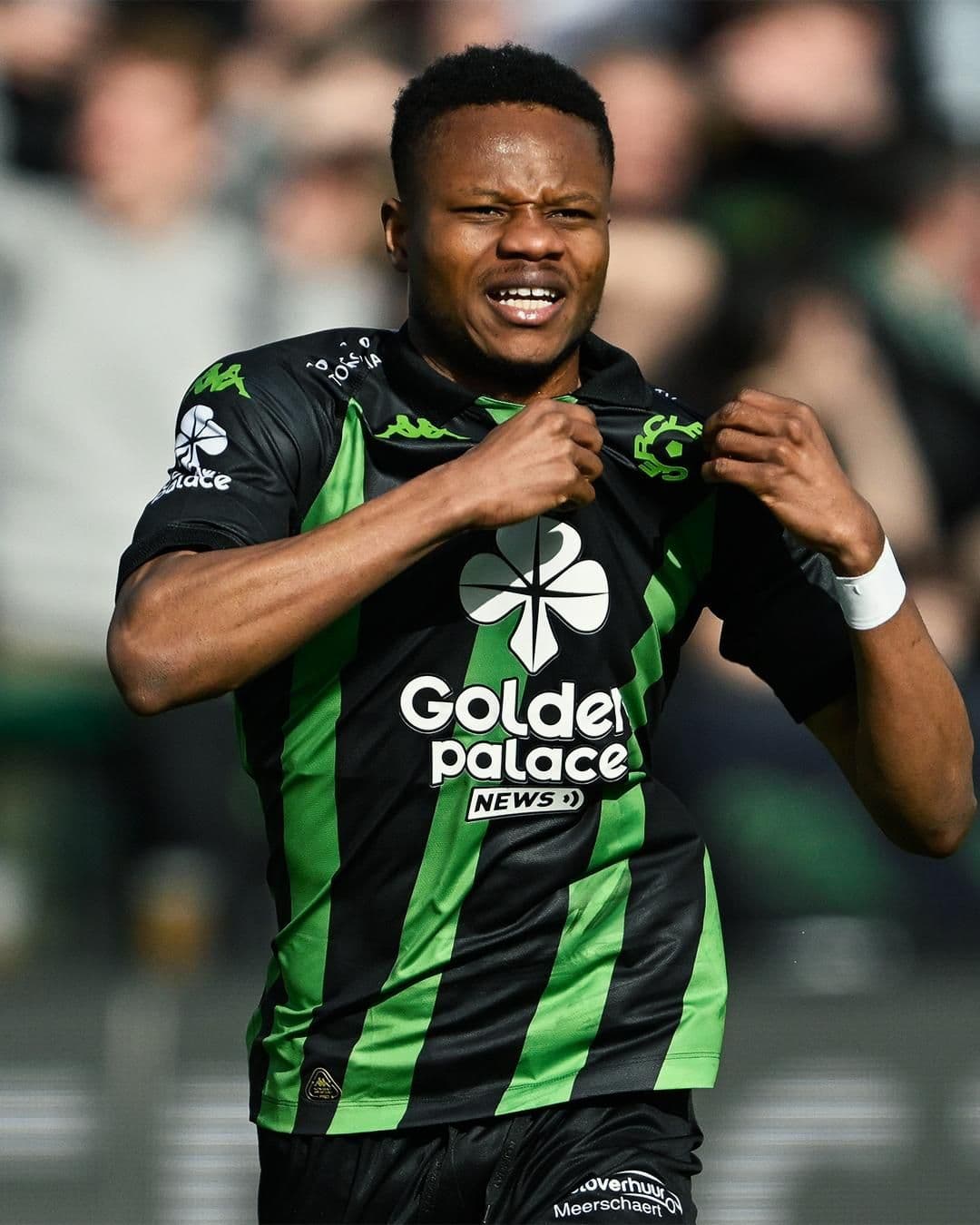 Lawrence Agyekum celebrating his 54th minute goal against K.V. Kortrijk in the Belgian Pro League at Guldensporen Stadion.Cercle X.C. Photo credit: Winesbyanton.